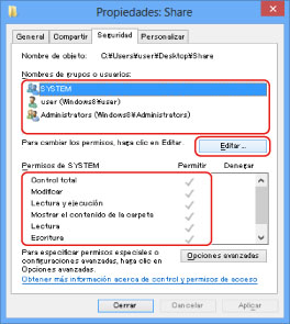 En el entorno de Active Directory, los procedimientos para especificar opciones de seguridad de la carpeta compartida son distintos de los anteriores. Para obtener más información, consulte el manual de Windows. |