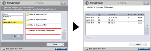 Se grabará un registro de bloqueo cuando las direcciones IP se han establecido de manera que se deniega la transmisión y recepción de datos con el equipo, y se intenta la transmisión y recepción entre el equipo y los dispositivos con esas direcciones IP. Además. cuando se transmitan datos, se guardará un registro de bloqueo para direcciones IP y números de puertos.