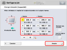 Para restaurar el valor acumulado, pulse [Restaurar opc. iniciales]. Si las marcas de registro no se imprimen en el papel de salida, el área impresa será igual al área del interior de las marcas de registro. |
