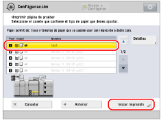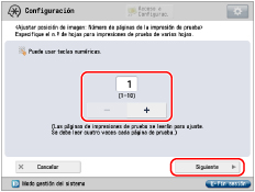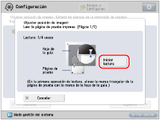 Cuanto mayor sea el número de imágenes de prueba impresas, más preciso será el ajuste. Si se especifican varias páginas de prueba impresas, asegúrese de que todas las páginas de prueba se leen en el orden en que se imprimen. Si se cambia el orden o el proceso de lectura no se realiza a continuación, el ajuste puede no efectuarse correctamente. |