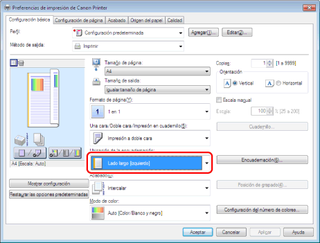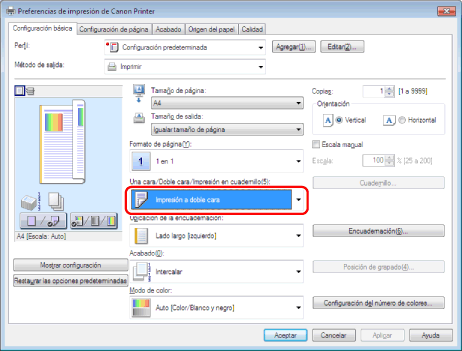 La configuración predeterminada para [Una cara/Doble cara/Impresión en cuadernillo] es [Impresión a doble cara]. También puede cambiar el valor predeterminado a [Impresión a una cara]. Para obtener instrucciones sobre cómo cambiar los valores predeterminados, consulte " Configurar las opciones de impresión prefijadas". |
