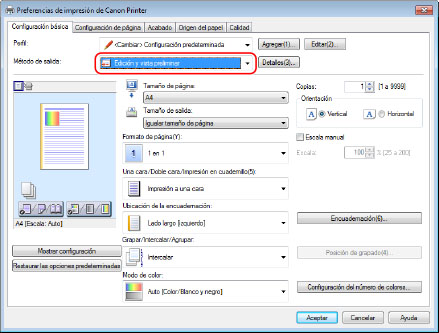 Puede establecer el Método de salida después de utilizar la opción Edición y vista preliminar si hace clic en [Detalles]. |