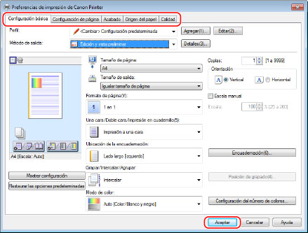 Para información detallada acerca de la configuración de Canon PageComposer, consulte la Ayuda. La pantalla puede variar según el sistema operativo y también en función del tipo y la versión del controlador de impresora. |