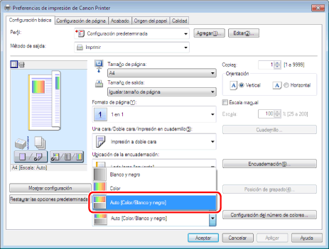 [Auto [Color/Blanco y negro]] cambia automáticamente entre impresión en color e impresión en blanco y negro en función del tipo de datos.