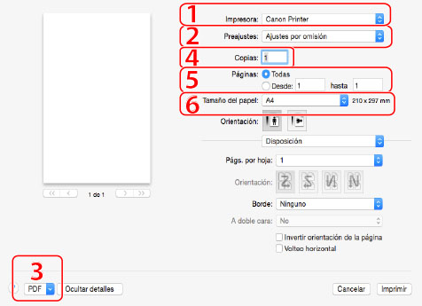 1. Selección de impresora | Seleccione la impresora que va a utilizar de entre las impresoras previamente añadidas en [Preferencias del Sistema]. Para obtener información sobre cómo añadir la impresora, consulte la Guía del controlador de impresora (vea "Instalación"). | 2. Preajustes | Las combinaciones de los ajustes de uso frecuente pueden guardarse como preajustes. Estos preajustes guardados pueden seleccionarse para imprimir (consulte "Utilizar [Preajustes] para imprimir"). |