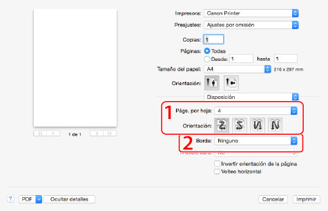 1. Formato de página | Imprime varias páginas en una hoja de papel (consulte "Impresión de varias páginas en una misma hoja"). | 2. Borde de página | Imprime cada página con un borde. |