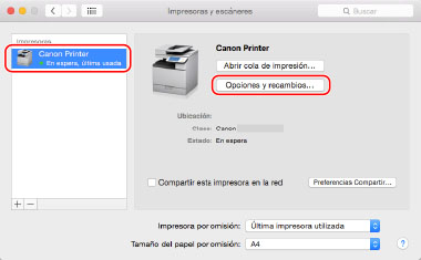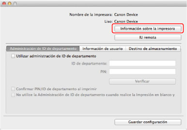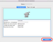 Si el nombre del controlador de impresora que se muestra en la parte superior del cuadro de diálogo [Información sobre la impresora] no se corresponde con el nombre de la impresora que se muestra como [Nombre recuperado de la impresora], es posible que no pueda utilizar las funciones de la impresora correctamente. Si los nombres no se corresponden, elimine la impresora que ha añadido en [Preferencias del Sistema] y vuelva a añadirla. Para obtener información detallada, consulte la Guía del controlador de impresora (consulte " Instalación"). La pantalla puede variar según el sistema operativo y aplicación, y también en función del tipo y la versión del controlador de impresora. |