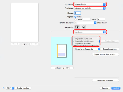 Seleccione su impresora → [Acabado] → seleccione [Impresión a una cara] o [Impresión a doble cara] en [Estilo de impresión].