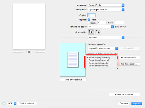 En [Ubicación de la encuadernación], seleccione el borde de encuadernación.