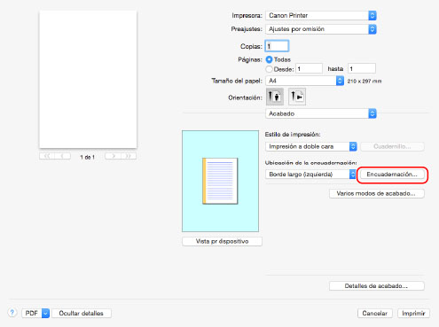 El valor predeterminado de [Estilo de impresión] es [Impresión a doble cara]. Puede registrar la opción de impresión a una cara como preajuste. Para información detallada, consulte " Utilizar [Preajustes] para imprimir". |