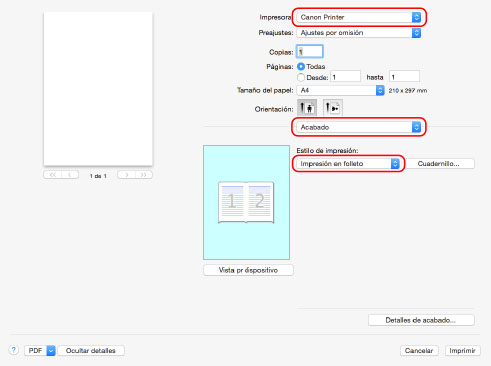 Seleccione su impresora → [Acabado] → [Impresión en folleto] en [Estilo de impresión].