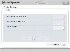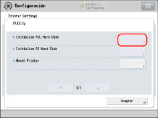 El disco duro no se puede inicializar en las siguientes condiciones: Cuando se están recibiendo o imprimiendo datos. (Se recomienda quitar el cable que conecta el equipo al concentrador para que la misma no reciba datos de impresión). Cuando se están instalando o desinstalando fuentes. Los pasos explicados a continuación son para inicializar la partición del disco duro PCL. Para inicializar la partición del disco duro PS, siga los mismos pasos excepto el paso 4, donde deberá seleccionar [Initialize PS Hard Disk]. |