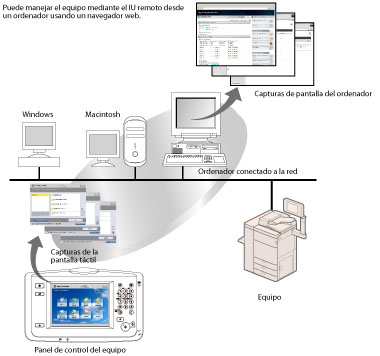 La IU (Interfaz del usuario) remota es un software preinstalado en el equipo que permite acceder a sus funciones mediante un navegador web. Por ejemplo, la IU remota permite acceder al equipo para comprobar el estado de los trabajos, ejecutar trabajos y especificar diversas opciones de configuración. Para usar la IU remota, tan solo necesita un navegador web y una conexión de red entre el ordenador y el equipo.