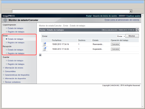 Haga clic en [Estado de trabajos] → haga clic en [Cancelar] para el trabajo que quiere eliminar.