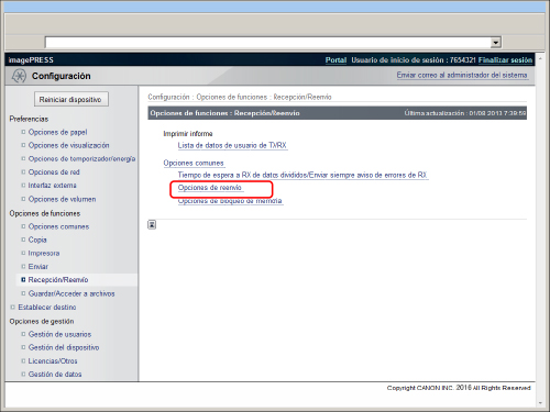 Para especificar las opciones de reenvío, es necesario iniciar sesión como administrador. |