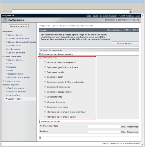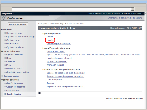 Si importa las opciones de gestión de ID de departamentos utilizando la función Importar todo, las opciones información administrador sistema como un ID o contraseña se sobrescribirán. Compruebe la información del administrador del sistema del equipo para exportación antes de utilizar la función Exportar todo, ya que se requiere para iniciar sesión en el equipo de destino para importación. La función Exportar todo no estará disponible en las situaciones siguientes: Al ejecutar/esperar por cualquier trabajo (envío, reenvío, recepción de i-fax, impresión de informes, funciones especificadas por el modo Envío diferido) Durante una operación de Importar/Exportar individualmente Al ver la libreta de direcciones utilizando la IU remota desde otra serie imagePRESS Al entregar información de dispositivos Mientras esté ocurriendo un error Copia de seguridad de datos de buzón |