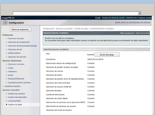 La pantalla resultados de importación/exportación no podrá mostrarse hasta que finalice la exportación. Si hace clic en [Iniciar descarga] , podrá descargar los archivos de exportación. Puede comprobar los resultados de la importación/exportación más reciente pulsando [Gestión de datos] para <Opciones de gestión> → [Importar/Exportar resultados]. |