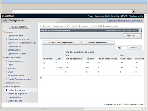 Para borrar el total de impresiones correspondiente al departamento, haga clic en [Borrar contador]. Haga clic en [Aceptar] cuando aparezca el cuadro de diálogo de confirmación. Las opciones de Gestión de ID de departamentos son las mismas que aquéllas a las que se puede acceder desde el panel de control del equipo al pulsar [Gestión de usuarios] (Configuración) → [Gestión de ID de departamentos]. Para más información acerca de la Gestión de ID de departamentos, consulte "Gestión de ID de departamentos". |