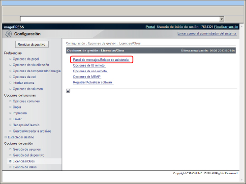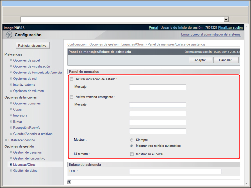Activar ventana emergente: | Seleccione esta opción para mostrar el panel de mensajes en la pantalla táctil como una ventana emergente. Si selecciona [Mostrar en el portal], el panel de mensajes se muestra en la página del portal de la IU remota. |