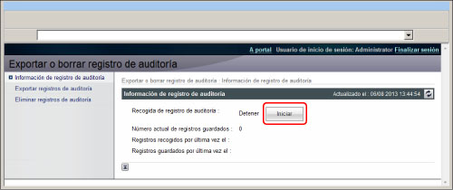 Haga clic en [Configuración] → [Gestión del dispositivo] → [Exportar o borrar registro de auditoría] → [Información de registro de auditoría] → [Iniciar] en <Recogida de registro de auditoría>.