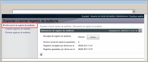 Puede iniciar o detener la recogida de información de un registro. Los registros recogidos se guardan como un solo archivo de registro de auditoría.