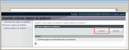 Haga clic en [Exportar] en <Exportar registros de auditoría>.