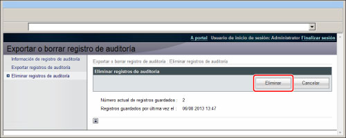 Haga clic en [Eliminar] en <Eliminar registros de auditoría>.