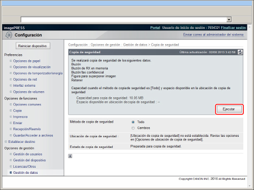 Si desea programar una copia de seguridad, haga clic en [Configuración] → [Gestión de datos] → [Opciones de copia de seguridad automática]. Seleccione [Copia de seguridad total] o [Copia de seguridad de cambios] y [Todos los días] o [Especificar días] → introduzca el momento en el que quiere hacer la copia de seguridad. |