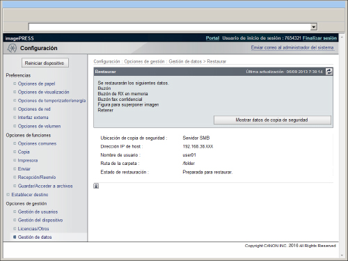 Si desea ver el registro de copia de seguridad/restauración, haga clic en [Configuración] → [Gestión de datos] → [Registro de copia de seguridad/restauración]. Si desea restaurar datos de una copia de seguridad cifrada, introduzca la misma contraseña que usó para hacer la copia de seguridad. Dependiendo de las opciones del equipo, es posible que no se restauren completamente los datos de la copia de seguridad o que se impriman automáticamente algunos documentos. La restauración se lleva a cabo después de enviar, recibir, almacenar o borrar todos los datos almacenados en el equipo, o documentos. |