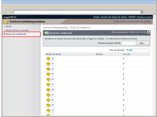 Haga clic en [Archivos recibidos/guardados] → [Buzón fax confidencial] → haga clic en el número del buzón deseado.