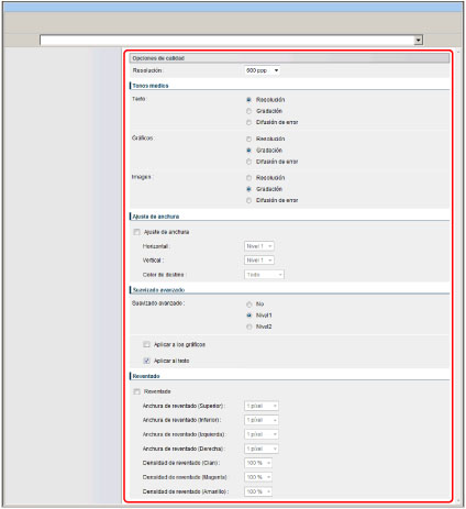 [Ajuste de anchura] | Esta opción le permite especificar si desea ajustar la anchura de caracteres o líneas. Puede especificar la anchura para [Vertical] y [Horizontal]. El resultado de [Nivel 2] es más ancho que [Nivel 1]. Si no puede obtener el resultado apropiado con [Nivel 1], seleccione [Nivel 2]. Puede especificar si desea ajustar la anchura de caracteres o líneas para todos los colores o solamente el negro seleccionando [Todo] o [Sólo negro] en [Color de destino]. Esta opción no puede utilizarse con [Reventado]. |
