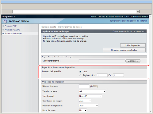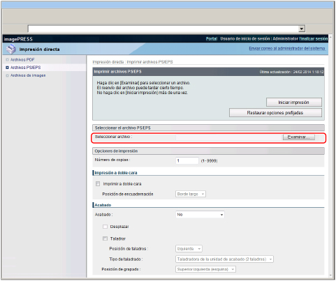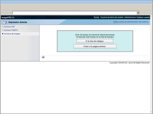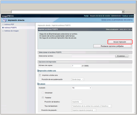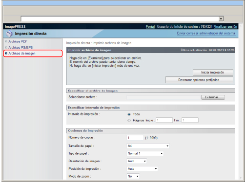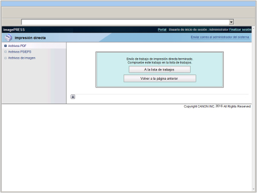 Para imprimir directamente archivos PS/EPS desde la IU remota, se requiere el Kit de Impresora imagePRESS. |