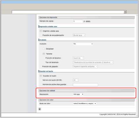[Resolución] | Esta opción especifica la resolución para impresión. La resolución se expresa en unidades de ppp (puntos por pulgada) que indica el número de puntos de una pulgada. Cuanto mayor sea el valor, mayor es la resolución, que permite una expresión más fina de los detalles. Si selecciona [600 ppp], podrá realizar la impresión adecuada a documentos y tablas en general. Si selecciona [1200 ppp], los caracteres y las líneas podrán imprimirse con precisión. |