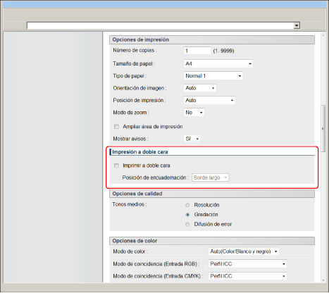 [Imprimir a doble cara] | Esta opción especifica si se desea imprimir en una cara o en ambas caras del papel. |