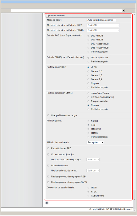 [Perfil de simulación CMYK] | Esta opción le permite especificar el objetivo de simulación para imprimir los datos de CMYK (Cyan Magenta Yellow blacK (cian, magenta, amarillo, y negro)). El equipo convierte los datos de CMYK en un modelo de colores CMYK dependiente de dispositivo basado en el objetivo de simulación seleccionado en el perfil de simulación de CMYK. [JapanColor(Canon)] Esta opción utiliza el perfil JapanColor. Este perfil es para obtener una impresión que coincide estrechamente con las normas de impresión de Japón. [US Web Coated(Canon)] Esta opción utiliza el perfil U.S. Web Coated. Este perfil es para obtener una impresión que coincide estrechamente con las normas de impresión de EE.UU. [Europeo estándar] Esta opción utiliza el perfil Euro Standard. Este perfil es para obtener una impresión que coincide estrechamente con las normas de impresión de Europa. [Ninguno] Cuando seleccione esta opción, los datos de CMYK dependientes de dispositivo se imprimirán como son sin que se aplique el perfil CMYK. [Perfil descargado] Esta opción utiliza el objetivo de simulación personalizada que ha descargado del ordenador host a este equipo utilizando iW Management Console. |