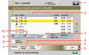 1 | [Eliminar] Se pulsa para eliminar los archivos guardados en el dispositivo de memoria. Puede seleccionar y eliminar hasta 32 archivos a la vez. |