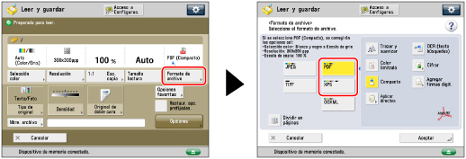 Si selecciona [Compacto] para el formato de archivo PDF o XPS, el modo de color cambia de [Auto (Color/B/N)] y [Blanco y negro] a [Auto (Color/Gris)] y [Escala de gris]. Si desea leer el documento con el modo de color que especifique, cambie el formato de archivo PDF o XPS a otro distinto de [Compacto] , [Trazar y suavizar], o [Color limitado]. |