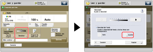 Si ajusta la densidad del fondo pulsando [Ajustar] para <Densidad del fondo>, la opción [Auto] se cancelará. De forma similar, si pulsa [Auto] mientras esté realizando ajustes manuales [Ajustar], sus ajustes se cancelarán. El equipo ajusta automáticamente la densidad para que coincida con el fondo.