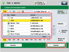 Los datos de la libreta de direcciones local se pueden guardar e importar mediante la IU remota. (Consulte "Cargar la información de configuración (Importar individualmente)".) Si sólo selecciona un destino, pulse para enviar desde la pantalla Libreta de direcciones. |