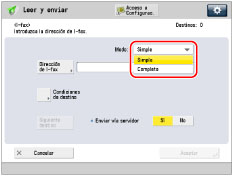 [Completo]: | Envía los datos leídos como una imagen a través de Internet, y le permite recibir la confirmación de que su I-fax se envió correctamente. |