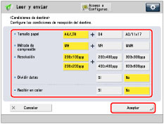 <Recibir en color>: | Especifique si el destino admite la recepción en color o no. Si el destino admitiera la recepción en color, pulse [Sí] → [Siguiente] → establezca el tamaño del papel y la resolución. Si el destino no admitiera la recepción en color, pulse [No] → establezca el tamaño del papel, el método de compresión y la resolución. |