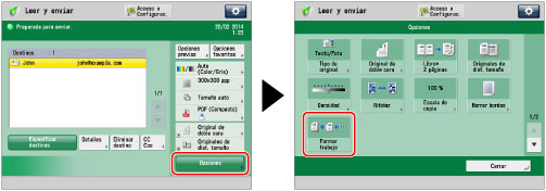 Sólo es posible cambiar las opciones que aparecen en [Cambiar opciones] mientras se encuentra en el modo Formar trabajo. Es necesario especificar de antemano las opciones de lectura pertinentes. Si pone los originales en el alimentador, retírelos de la bandeja de salida de originales una vez finalizada la lectura de cada lote. El máximo número de páginas que se puede enviar es 999. Cuando se utiliza [Formar trabajo], aparece un mensaje preguntándole si desea enviar el trabajo cuando se hayan leído 999 páginas de los originales. Si selecciona enviar el trabajo, se envían las 999 páginas leídas. Si cancela el trabajo, no se envían las páginas leídas. |