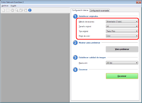 Puede especificar la configuración detallada para la lectura en la ficha [Configuración avanzada]. Además de los elementos que pueden establecerse en la ficha [Configuración básica], también puede establecer lo siguiente: Orientación original Páginas para escanear Especificación del área de lectura como un valor numérico Ajuste de densidad de las imágenes leídas Configuración de color Eliminación de bordes Relación de compresión de las imágenes leídas Si desea obtener información detallada sobre la configuración, consulte la Ayuda (consulte "Visualización de la Ayuda"). |