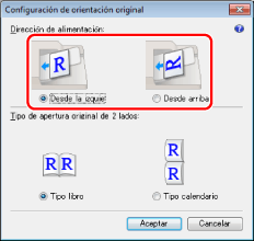 En el caso de originales de doble cara, seleccione también [Tipo de apertura original de 2 lados] para indicar la relación entre las caras anterior y posterior del original.