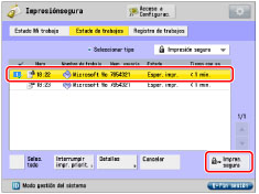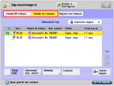 Puede pulsar [Estado Mi trabajo] o [Estado de trabajos] en la pantalla Impresión segura, podrá comprobar el estado de los trabajos de impresión.