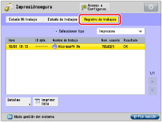 Si está desactivada la opción [Registro de trabajos] en [Opciones de gestión] (Configuración), no aparece el [Registro de trabajos] para cada pantalla. |