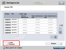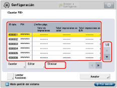 Puede borrar los valores incorrectos pulsando  . Puede especificar el límite de páginas entre 0 y 999.999. Una vez alcanzado un límite de páginas, no es posible copiar, leer, imprimir. El número de caras hace referencia al número de caras impresas. Consecuentemente, el número de caras de una impresión a doble cara se cuenta como dos. El límite de páginas hace referencia al número máximo de caras impresas. |