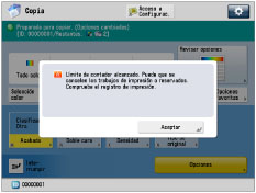 Puede borrar los valores incorrectos pulsando  . Puede especificar el límite de páginas entre 0 y 999.999. Una vez alcanzado un límite de páginas, no es posible copiar, leer, imprimir. Cuando se alcance el límite de páginas, aparecerá la pantalla siguiente. Al copiar:  Al leer un original para enviarlo:  Al imprimir:  |
