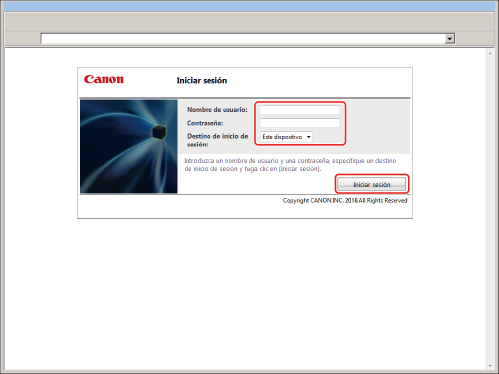 También puede iniciar sesión introduciendo la URL de la página de gestión de información de opciones de usuario en la barra de direcciones, como se indica a continuación. (Distingue entre mayúsculas y minúsculas). http://<dirección IP del equipo o nombre de host>:8000/pref/ |