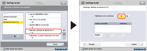 Pulse [Restringir dominios de destino de TX] → [Sí] para <Restringir envío a dominios>.